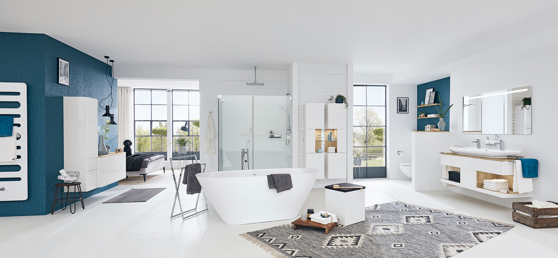 Asymmetrische Waschtischanlage in fünf Breiten und eine großzügige Doppelwaschtisch-Lösung